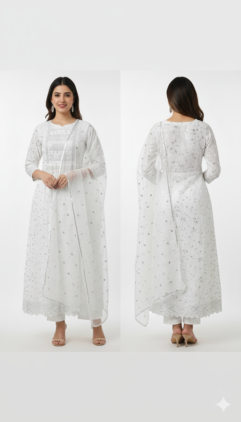 The combination of delicate Chikankari embroidery and subtle Mukesh highlights ensures a look that’s elegant, traditional, and effortlessly modern.